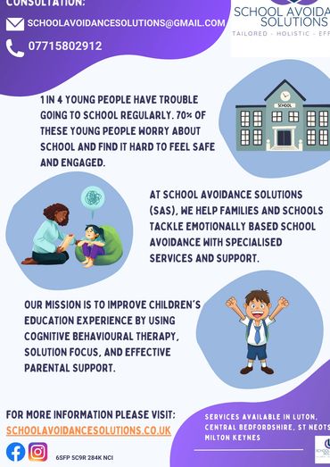 Welcome to School Avoidance Solutions (SAS), where we offer specialised services to support families and schools in addressing (Emotionally Based) School Avoidance in Central Bedfordshire, Milton Keynes, Luton and St. Neots. Our mission is to empower children to overcome emotionally based school avoidance through specialised services, fostering a collaborative and holistic environment, and enhancing their attendance, engagement, and overall happiness in education.
